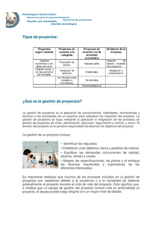Este documento define conceptos generales de la gestión de proyectos. Explica que un proyecto es un conjunto de acciones ordenadas para lograr un objetivo, y que la gestión de proyectos involucra aplicar conocimientos y herramientas a las actividades de un proyecto para cumplir con sus requisitos. También describe las diferentes etapas de un proyecto, incluyendo preinversión, inversión, construcción, operación, evaluación y liquidación.