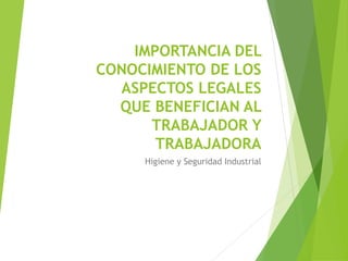 Este documento discute la importancia del conocimiento de los aspectos legales relacionados con la higiene y seguridad industrial. Explica brevemente varias leyes y decretos venezolanos relacionados con este tema, incluyendo la Constitución de Venezuela, la Ley Orgánica del Trabajo, la Ley Orgánica del Sistema de Seguridad Social y la Ley Orgánica de Prevención, Condiciones y Medio Ambiente de Trabajo. El documento enfatiza que las instituciones deben cumplir con las regulaciones de seguridad para prevenir