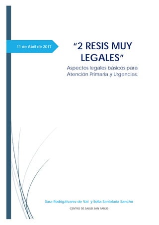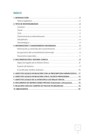 Este documento resume los principales aspectos legales para médicos de atención primaria y urgencias en España. Aborda temas como los tipos de responsabilidad médica, el consentimiento informado, la documentación clínica, la prescripción farmacéutica, el secreto profesional y otros aspectos legales importantes para la práctica médica diaria. El objetivo es ayudar a los médicos a comprender mejor sus obligaciones legales y así garantizar los derechos de los pacientes y prevenir errores.