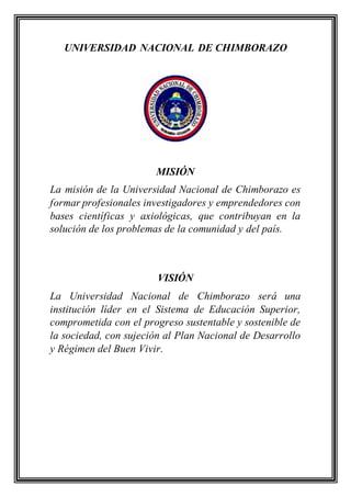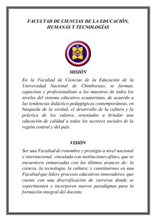 La Universidad Nacional de Chimborazo busca formar profesionales investigadores y emprendedores que contribuyan a resolver los problemas de la comunidad y el país. La Facultad de Ciencias de la Educación, Humanas y Tecnologías forma maestros de acuerdo a tendencias didácticas contemporáneas, mientras que la Escuela de Psicología Educativa, Orientación Vocacional y Familiar busca formar psicólogos educativos con un alto nivel científico y humano.