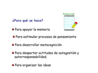 La bitácora COL es una herramienta para apoyar la memoria, estimular el pensamiento y desarrollar la metacognición. Consiste en responder preguntas sobre lo que pasó, lo que se sintió y lo que se aprendió. Es importante hacerla repetidamente y recibir retroalimentación del grupo para promover procesos reflexivos.