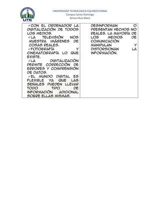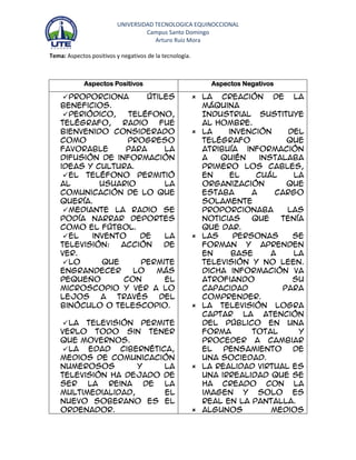 Este documento resume los aspectos positivos y negativos de la tecnología. Entre los aspectos positivos se encuentran que la tecnología proporciona beneficios útiles como la comunicación y difusión de información e ideas. También permite ver cosas de lejos y en detalle. Entre los aspectos negativos están que la tecnología puede sustituir al hombre en trabajos y que algunos medios desinforman o manipulan la información. Además, la tecnología puede afectar la capacidad de las personas para comprender si se basan demasi