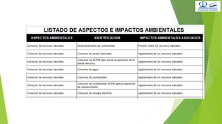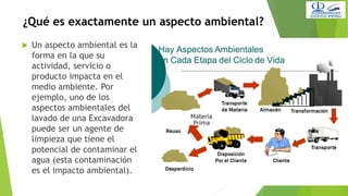 Este documento describe los cuatro pasos clave para identificar y evaluar los aspectos e impactos ambientales de una empresa de acuerdo con la norma ISO 14001: 1) Definir el alcance del sistema de gestión ambiental, 2) Identificar los aspectos ambientales directos e indirectos, 3) Evaluar qué aspectos son significativos basado en su potencial de daño ambiental, y 4) Gestionar adecuadamente los aspectos significativos a través de controles como procedimientos y formación.