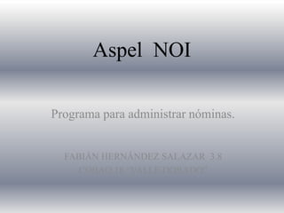Este documento proporciona instrucciones paso a paso para utilizar el programa Aspel NOI para administrar nóminas. Explica cómo iniciar sesión, seleccionar un directorio y fecha, agregar datos de trabajadores como nombre, salario e IMSS, y agregar nuevos departamentos y puestos dando clic en las opciones correspondientes en los menús y llenando los formularios requeridos.