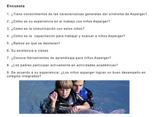 El documento presenta información sobre el síndrome de Asperger. En 3 oraciones: Resume que el síndrome de Asperger es un trastorno del desarrollo caracterizado por dificultades en la interacción social, comunicación y comportamientos repetitivos, y describe algunas características clínicas como intereses limitados y problemas en la socialización. Además, presenta sugerencias pedagógicas para trabajar con niños que tienen este síndrome en el aula.