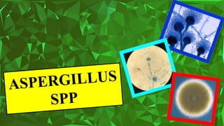 La aspergilosis es una infección causada por el hongo Aspergillus que afecta principalmente el sistema respiratorio de aves y bovinos. Es una enfermedad oportunista que se presenta cuando el sistema inmunológico está comprometido. Los principales síntomas incluyen dificultad respiratoria, diarrea y emaciación en aves, mientras que en bovinos puede causar abortos. El diagnóstico se realiza mediante cultivo y pruebas serológicas, y el tratamiento implica el uso de antifú