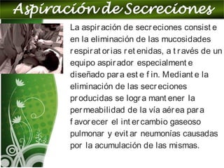 1) La aspiración de secreciones consiste en eliminar mucosidades respiratorias retenidas usando un equipo aspirador diseñado para esto.