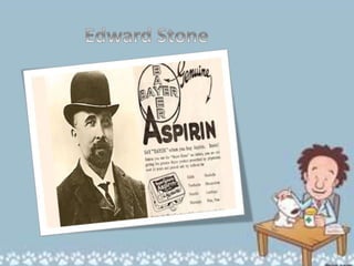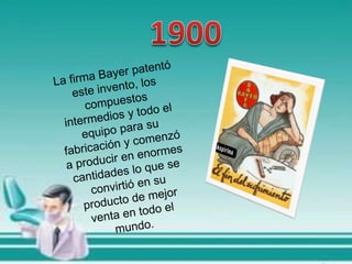 El documento describe la historia de la aspirina, desde sus orígenes como tratamiento a base de corteza de sauce blanco en el siglo 18 hasta su desarrollo como fármaco moderno. Explica cómo se extrajo el ácido acetilsalicílico de plantas y cómo Hoffman lo nombró "Aspirina" en 1899. También resume sus usos como analgésico, antiinflamatorio y antiagregante plaquetario, así como los síntomas y tratamiento de una sobredosis aguda.