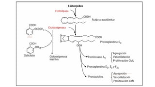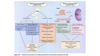Este documento describe la historia del tratamiento del dolor desde las civilizaciones antiguas hasta el desarrollo moderno de los antiinflamatorios no esteroideos como la aspirina. Se detalla el uso de plantas medicinales por parte de las primeras sociedades y el descubrimiento de analgésicos como la morfina y la aspirina. Asimismo, explica los mecanismos de acción de los AINEs a través de la inhibición de las enzimas ciclooxigenasas.