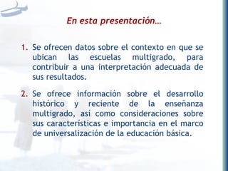 El documento presenta datos sobre el contexto y desempeño de las escuelas multigrado en México. Explica que estas escuelas se ubican principalmente en pequeñas localidades rurales con menos de 100 habitantes, y atienden a una población con condiciones desfavorables que afectan el aprendizaje. Los resultados educativos de estas escuelas son menores en comparación con escuelas urbanas, debido a factores como los limitados recursos y el entorno desfavorable. A pesar de esto, las escuelas multigrado siguen siendo numerosas en