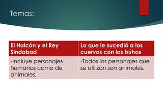 Este documento compara dos historias: "El Halcón y el Rey Sindabad" y "Lo que sucedió a los cuervos con los búhos". Analiza los temas, personajes, narradores, enseñanzas, moralejas y referencias de ambas historias. Explica que la primera incluye personajes humanos y animales y trata sobre un halcón leal a un rey, mientras que la segunda solo incluye animales y trata sobre el engaño de los cuervos a los búhos. Ambas historias tienen el propósito de ense