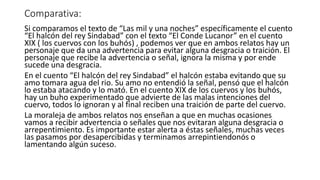 En ambos cuentos, un personaje intenta advertir a otro de un peligro inminente, pero es ignorado. En "El halcón del rey Sindabad", el halcón trata de evitar que su amo beba del río, pero es asesinado. En "Los cuervos y los buhós", un buho experimentado advierte sobre las malas intenciones de un cuervo, pero es ignorado y luego traicionado. Ambos cuentos enseñan la lección de estar atentos a las advertencias para evitar desgracias.