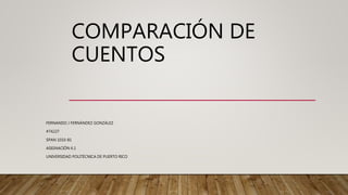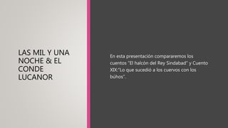 Este documento compara dos cuentos, "El halcón del Rey Sindabad" de Las mil y una noches y "Lo que sucedió a los cuervos con los búhos" del Conde Lucanor. Analiza los temas, personajes, narradores y moralejas de ambos cuentos, señalando similitudes y diferencias entre ellos.