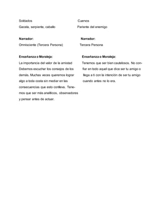 El documento compara un cuento de Las mil y una noches con un relato de El Conde Lucanor. Ambos cuentos tratan sobre la prudencia, la cautela y la importancia de escuchar consejos. El cuento de Las mil y una noches se enfoca en la lealtad entre el rey y su halcón, mientras que el relato de El Conde Lucanor advierte sobre la necesidad de no confiar completamente en aquellos que dicen ser amigos.