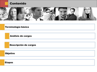 El documento aborda el análisis y descripción de cargos, que consiste en identificar, estudiar y ordenar las responsabilidades y requisitos de un puesto de trabajo. Esto es esencial para definir funciones claras, mejorar la administración de recursos humanos y cumplir con normativas de calidad. Además, se detallan etapas y requisitos necesarios para la elaboración de descripciones de puestos, considerando la evolución de la organización.
