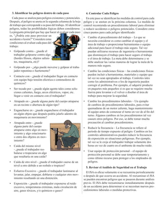 Este documento proporciona información sobre el Análisis de Seguridad en el Trabajo (JSA), incluyendo sus objetivos, definición, pasos y beneficios. Un JSA identifica peligros y medidas de control en cada paso de un trabajo para prevenir accidentes. Los cinco pasos de un JSA son: 1) seleccionar el trabajo, 2) dividirlo en pasos, 3) identificar peligros, 4) controlarlos, y 5) revisar periódicamente el análisis. Un JSA capacita a los empleados en procedimientos