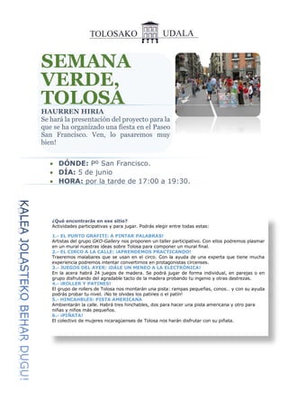 Se organizará una fiesta en el Paseo San Francisco de Tolosa el 5 de junio de 17:00 a 19:30 para presentar el proyecto "Semana Verde, Tolosa Haurren Hiri". La fiesta incluirá varias actividades participativas como talleres de graffiti, malabares del circo, juegos de madera, patinaje en línea, hinchables y una piñata.