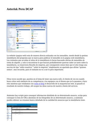 La página web está directamente vinculada a los inmuebles, y la gestión inmobiliaria publica las propiedades en la página web. Los visitantes buscan ofertas de venta o alquiler e información sobre la inmobiliaria. El sitio debe incluir una sección "Sobre nosotros" con información básica. Los clientes comparan el diseño con la competencia y sugieren nuevas ideas. Los scripts pueden obtener detalles e imágenes de los anuncios y resúmenes de la cantidad de propiedades.