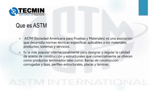 El documento detalla la función de la ASTM (Sociedad Americana para Pruebas y Materiales) como desarrolladora de normas técnicas para regular la calidad de materiales como acero, plásticos y pinturas. Se explica la estructura de los códigos ASTM, que incluye especificaciones para diferentes tipos de acero y otros metales, así como sus aplicaciones en la industria de la construcción. Además, se abordan las normas específicas para plásticos y recubrimientos, estandarizando sus propiedades y métodos de aplicación.