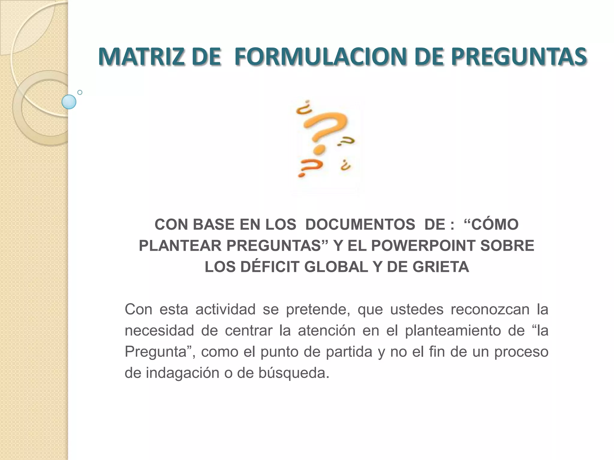 Este documento presenta una matriz para formular preguntas basadas en documentos sobre cómo plantear preguntas y déficits globales y de grieta. El objetivo es que los estudiantes reconozcan la importancia de centrarse en formular preguntas como punto de partida de un proceso de indagación. Además, proporciona ejemplos de preguntas sobre agujeros en las nubes y estrategias para evitar el plagio al citar fuentes.