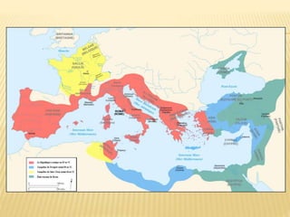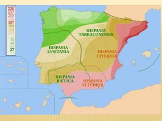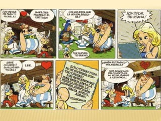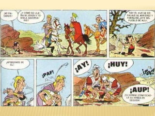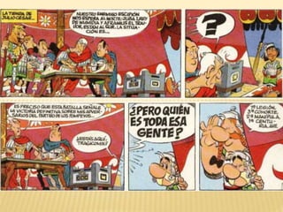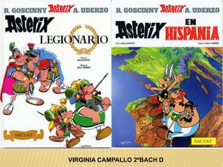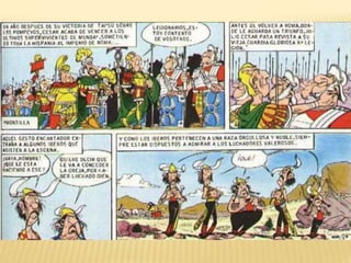 Este documento resume dos historietas de Astérix. En la primera, Astérix y Obélix ayudan a Falbalá a rescatar a su prometido Tragicómix, que ha sido hecho prisionero por los romanos. En la segunda, Astérix y Obélix acompañan a Pepe de vuelta a su familia en Hispania, mientras evaden al legionario romano Nonpossumus. También incluye información sobre el contexto histórico de la conquista romana de la Galia y Hispania.