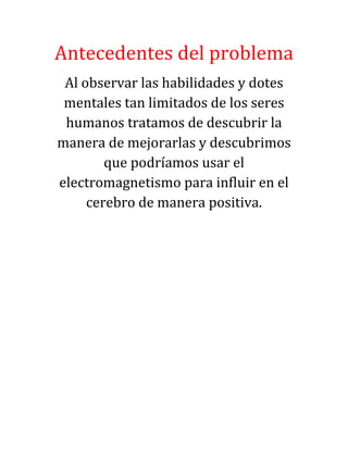 Este documento presenta un proyecto para desarrollar un casco que use ondas electromagnéticas para mejorar las habilidades mentales y artísticas de las personas al desactivar temporalmente la actividad cerebral en áreas específicas. El proyecto tiene como objetivo general elevar las capacidades mentales de la humanidad y como objetivos específicos crear un prototipo bien fundamentado y aprender sobre temas relacionados. La mejor solución propuesta es desactivar temporalmente la actividad cerebral en áreas específicas usando el casco.