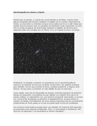 Este documento describe una técnica de astrofotografía sin montura motorizada que consiste en apilar múltiples tomas cortas de exposición para revelar objetos débiles en el cielo nocturno. Explica que al combinar numerosas tomas de 6 segundos cada una y sustrayendo tomas de ruido, se puede mejorar notablemente la imagen final cancelando el ruido y amplificando la débil luz captada. También discute otros aspectos como el enfoque, el uso de parasoles, la temperatura del sensor y los programas de procesamiento