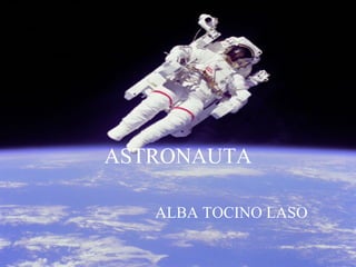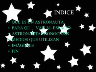 Este documento resume lo que es un astronauta, incluyendo que son tripulantes de vehículos espaciales y que viajan al espacio para obtener información sobre planetas, astros y estrellas. También menciona algunos astronautas conocidos como Yuri Gagarin, el primero en orbitar la Tierra; Alan Shepard, el primer estadounidense en el espacio; y Neil Armstrong y Buzz Aldrin, los primeros en caminar sobre la Luna. Finalmente, describe algunos de los medios de transporte espacial que usan los astronautas como la nave Discovery One