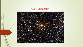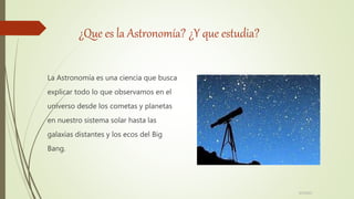 La astronomía es una ciencia que estudia el universo, abarcando desde cometas y planetas hasta galaxias lejanas y el origen del universo a través de una gran explosión. Su historia se remonta a las antiguas civilizaciones que buscaban predecir fenómenos celestes y ha evolucionado con el desarrollo de nuevas herramientas y teorías. Además de ayudar en la orientación terrestre, la astronomía busca un mayor entendimiento del cosmos y plantea nuevas preguntas sobre nuestro lugar en él.