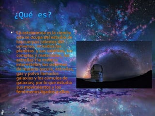 El documento resume los principales temas de la astronomía, incluyendo la definición de la astronomía, su historia y desarrollo a través de figuras como Aristóteles, Copérnico y Galileo, los diferentes tipos de observaciones astronómicas como la visible, infrarroja y de rayos X, y las ramas principales como la cosmología, astrofísica y mecánica celeste. Explica también los instrumentos de observación como el telescopio y los objetos del sistema solar.