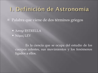 Este documento trata sobre la astronomía y la mitología griega. Explica que la astronomía es la ciencia que estudia los cuerpos celestes y sus movimientos, mientras que la astrología se ocupa de la supuesta influencia de los astros en las personas. Luego menciona a varios pensadores griegos antiguos como Aristarco de Samos y sus teorías sobre el sistema solar. Finalmente, describe cómo los griegos asignaron nombres de dioses y personajes mitológicos a los planetas, estrellas y constelaciones.