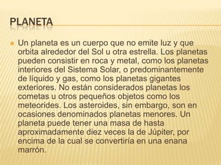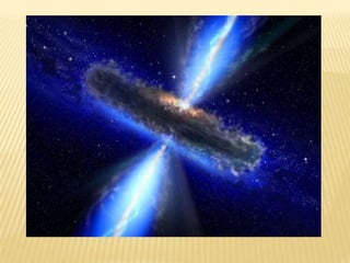 El documento trata sobre diversos temas astronómicos como planetas, estrellas, agujeros negros, galaxias, nebulosas, cuásares y púlsares. Explica las características fundamentales de cada uno de estos objetos astronómicos, incluyendo su composición, estructura y procesos físicos asociados. También describe algunos descubrimientos clave como el primer púlsar detectado y el desarrollo del modelo teórico que lo explica.