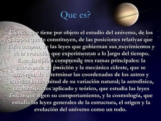 La astronomía es la ciencia que estudia el universo y los objetos celestes. Se ha desarrollado a lo largo de la historia, desde las primeras observaciones de culturas antiguas hasta el establecimiento de las bases científicas en la era moderna. Figuras clave como Copérnico, Kepler y Brahe sentaron las bases de nuestro entendimiento actual sobre el sistema solar y los movimientos planetarios.