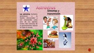 Los astrovirus son una causa común de gastroenteritis aguda en niños y adultos, causando síntomas como diarrea, náuseas y vómitos que suelen durar 3-4 días. Son virus de ARN que infectan mamíferos y aves. No hay tratamiento específico, pero la higiene personal puede reducir su propagación.