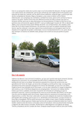 Este documento resume un viaje familiar a Asturias y Cantabria del 1 al 16 de agosto de 2011. Incluye detalles de 7 días de visitas a lugares como Haro, el condado de Treviño, Avilés, Cabo Peñas, Oviedo y una sidrería. El viaje se hizo en coche y caravana, alojándose en diferentes campings. El clima fue mayormente nublado con lluvia, aunque hubo días soleados. Se visitaron puntos de interés culturales e históricos, playas y se probaron especial