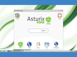 Este documento presenta las características y novedades de Asturix 3 y Asturix 3 Lite. Incluye reconocimiento facial, aplicaciones web, redes sociales y microblogging, un instalador de aplicaciones, música libre de Jamendo, un teclado virtual, gestor de archivos, suite ofimática, navegador web Chromium y enlaces para obtener más información y hacer preguntas.
