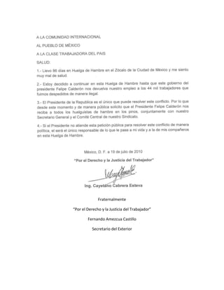 El documento describe que durante una conferencia de prensa de un sindicato mexicano, uno de sus miembros en huelga de hambre sufrió un síncope cardiaco después de 81 días en huelga, lo que demuestra que la salud de los huelguistas se está deteriorando rápidamente. El sindicato está pidiendo reanudar las negociaciones para resolver el conflicto laboral y evitar más problemas de salud. Otro miembro en huelga de hambre con 85 días envió una carta al presidente de México pidiendo una audiencia para resolver el as