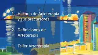 Este documento presenta una historia del arte terapia, incluyendo sus precursores más importantes como Margaret Naumburg, Adrian Hill y Edith Kramer. También define arte terapia según asociaciones como la Británica, Americana y Española. Finalmente, ofrece ejemplos históricos de obras de arte y cómo estas han sido usadas en procesos terapéuticos. El documento provee una introducción general a la historia y definiciones fundamentales de la arte terapia.