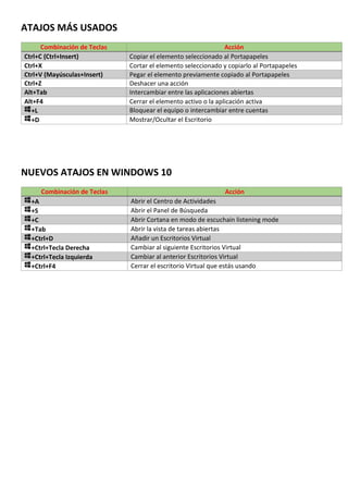 Este documento proporciona una lista extensa de atajos de teclado comunes en Windows 10, incluyendo atajos para copiar, cortar, pegar, deshacer acciones, intercambiar entre aplicaciones y ventanas, y navegar documentos. También incluye atajos para usar el explorador de archivos, los escritorios virtuales, la barra de tareas, la configuración del sistema, y la lupa.