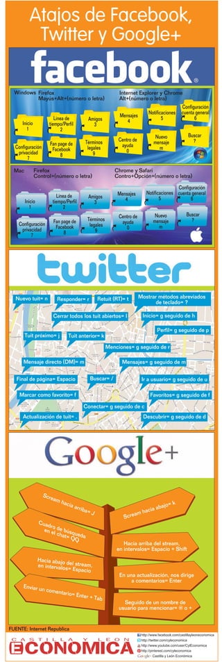 Este documento proporciona atajos de teclado para Facebook, Twitter, Google+ y Chrome/Firefox. Incluye atajos para acceder rápidamente a funciones como mensajes, perfil, notificaciones y configuración en las diferentes plataformas desde el teclado de una computadora. También incluye atajos específicos para realizar acciones en Twitter como publicar tweets, responder, retuitear y buscar, asi como para interactuar en Google+ mediante comentarios, menciones y actualizaciones.