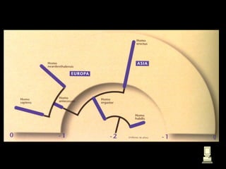 Este documento describe la evolución de los primates y los homínidos, incluyendo sus características físicas clave a lo largo del tiempo. También resume los principales descubrimientos en sitios arqueológicos como Gran Dolina y Sima de los Huesos en España, incluyendo fósiles que muestran las primeras poblaciones de Homo en Europa y una nueva especie encontrada.