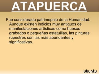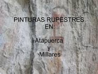 El documento habla sobre pinturas rupestres encontradas en dos lugares: Atapuerca, que fue declarado patrimonio de la humanidad y contiene abundantes pinturas significativas, y Millares, un pequeño municipio valenciano donde se han encontrado restos de pinturas rupestres en cuevas.
