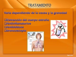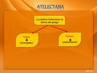 La atelectasia se define como el colapso parcial o total del tejido pulmonar, clasificada en obstructiva, por compresión, por contracción y adhesivas, dependiendo de la causa. Sus síntomas incluyen disnea, cianosis y dolor torácico, y se diagnostica a través de métodos como radiografías y cultivos de esputo. El tratamiento puede incluir broncodilatadores, antibióticos y mucolíticos, junto con intervenciones de enfermería para monitorear y mejorar la función respiratoria.