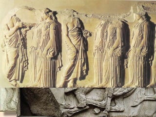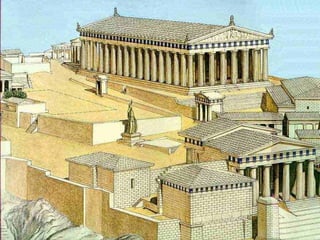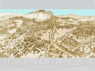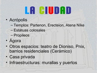 Este documento describe los principales espacios de la ciudad clásica de Atenas. La Acrópolis era el centro religioso y político que albergaba importantes templos como el Partenón, el Erecteión y el templo de Atenea Nike. El ágora era el centro de la vida social y económica. Otros lugares importantes incluían los teatros, santuarios, estadios y barrios residenciales. La ciudad también contaba con murallas defensivas y puertos como el de El Pireo.
