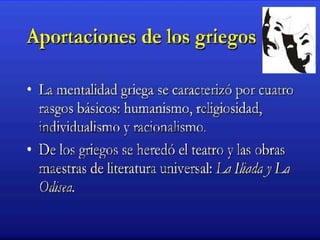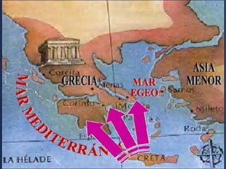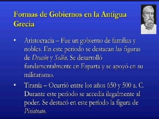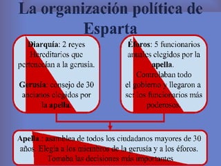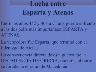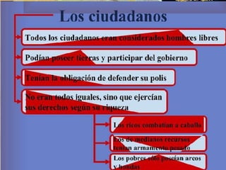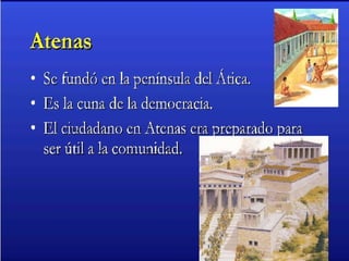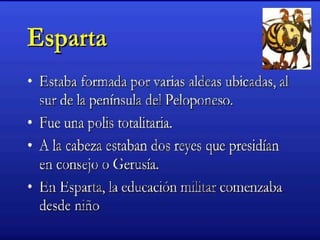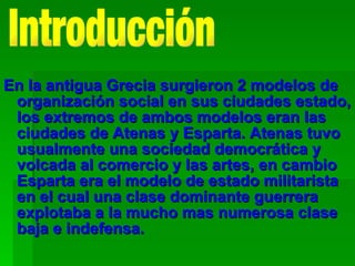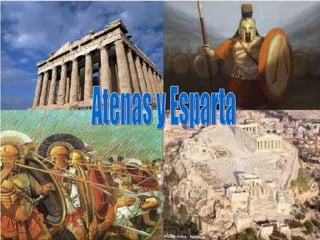 Las ciudades de Atenas y Esparta representaron dos modelos opuestos de organización social en la antigua Grecia. Atenas tenía una sociedad democrática y comercial, mientras que Esparta era un estado militarista donde una clase guerrera dominante explotaba a la clase baja. La antigua Grecia estaba dividida en pequeñas ciudades-estado independientes como Atenas y Esparta, que se diferenciaban en sus gobiernos, leyes, escuelas, teatros y enfoque militar o no militar.