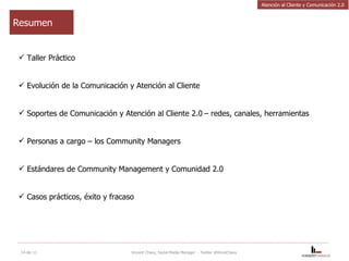 El documento habla sobre un taller práctico sobre atención al cliente y comunicación 2.0. Explica la evolución de la atención al cliente tradicional a la atención al cliente 2.0 a través de redes sociales y canales online. También describe las herramientas y roles clave para escuchar, monitorear y analizar la conversación en redes sociales con el fin de mejorar la experiencia del cliente.