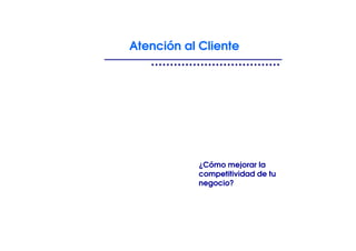 Este documento describe los conceptos clave de la atención al cliente y cómo mejorar la competitividad de un negocio a través de una buena atención al cliente. Explica que la satisfacción del cliente, la calidad del servicio y la atención al cliente son fundamentales para tener éxito en mercados competitivos. También describe las fases de la atención al cliente, la importancia de la comunicación y la profesionalidad.