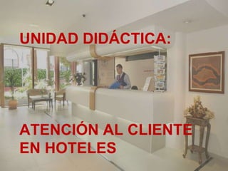 Este documento presenta una unidad didáctica sobre la atención al cliente en hoteles. Explica que el módulo cubre la recepción y reservas, e incluye normas para el personal, la importancia del trato al cliente, y cómo atender llamadas y correos. También describe diferentes tipos de clientes y requerimientos específicos para reservas, check-in y check-out.