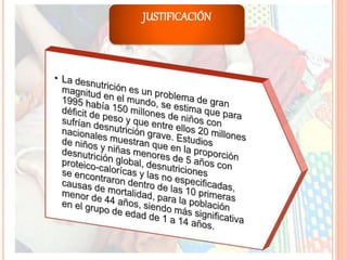 Este documento presenta una guía de atención para la desnutrición. Explica que la desnutrición es una condición patológica causada por la carencia de nutrientes debido a un insuficiente aporte de energía o gasto excesivo. Detalla los factores de riesgo y protectores, y describe la población objetivo, la valoración nutricional, la identificación de desnutrición, el tratamiento multidisciplinario y la importancia de la educación nutricional para los padres. El objetivo es lograr una mejoría del estado nutric