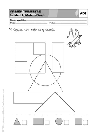 Este documento contiene una serie de páginas de material fotocopiable para estudiantes de primaria de la editorial Grupo Anaya. Cada página presenta actividades de matemáticas para que los estudiantes completen, como buscar piezas iguales, recortar y pegar viñetas en orden, y unir partes de objetos. El material está organizado en unidades divididas en tres trimestres escolares.